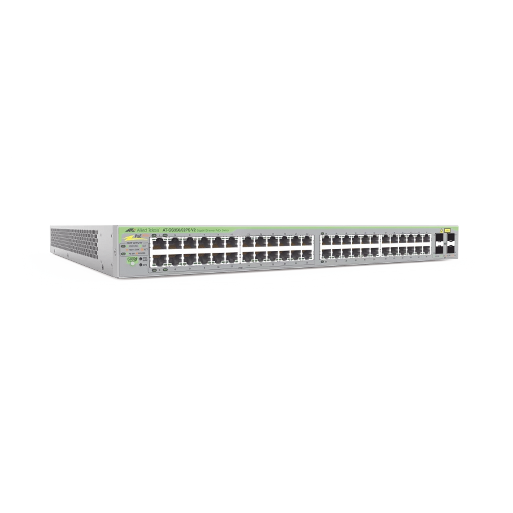 El conmutador Allied Telesis GS950/52PS V2 Gigabit PoE+ WebSmart cuenta con 48 puertos 10/100/1000T y cuatro puertos SFP, que ofrecen hasta 30 vatios por puerto (PoE+) para soportar cámaras de videovigilancia, puntos de acceso inalámbricos, teléfonos IP y otros puertos alimentados por PoE. dispositivos. PoE+ elimina la necesidad de cableado de alimentación separado y minimiza el desorden de fuentes de alimentación y adaptadores para una implementación simplificada.