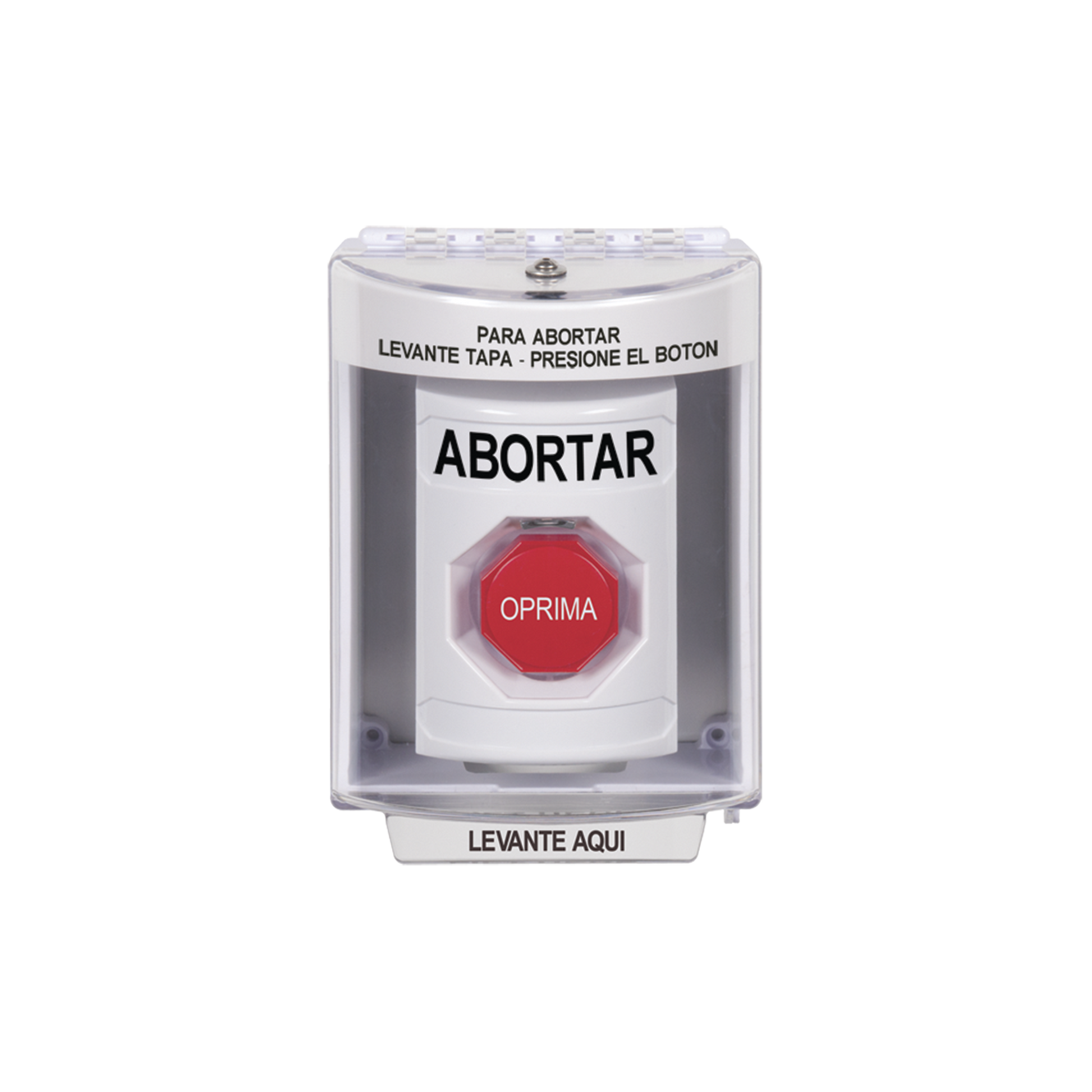 Botón de Abortar, Bocina de Advertencia Integrada, Texto en Español, Tapa Protectora de Policarbonato Súper Resistente con Espaciador, Restablecimiento con Llave