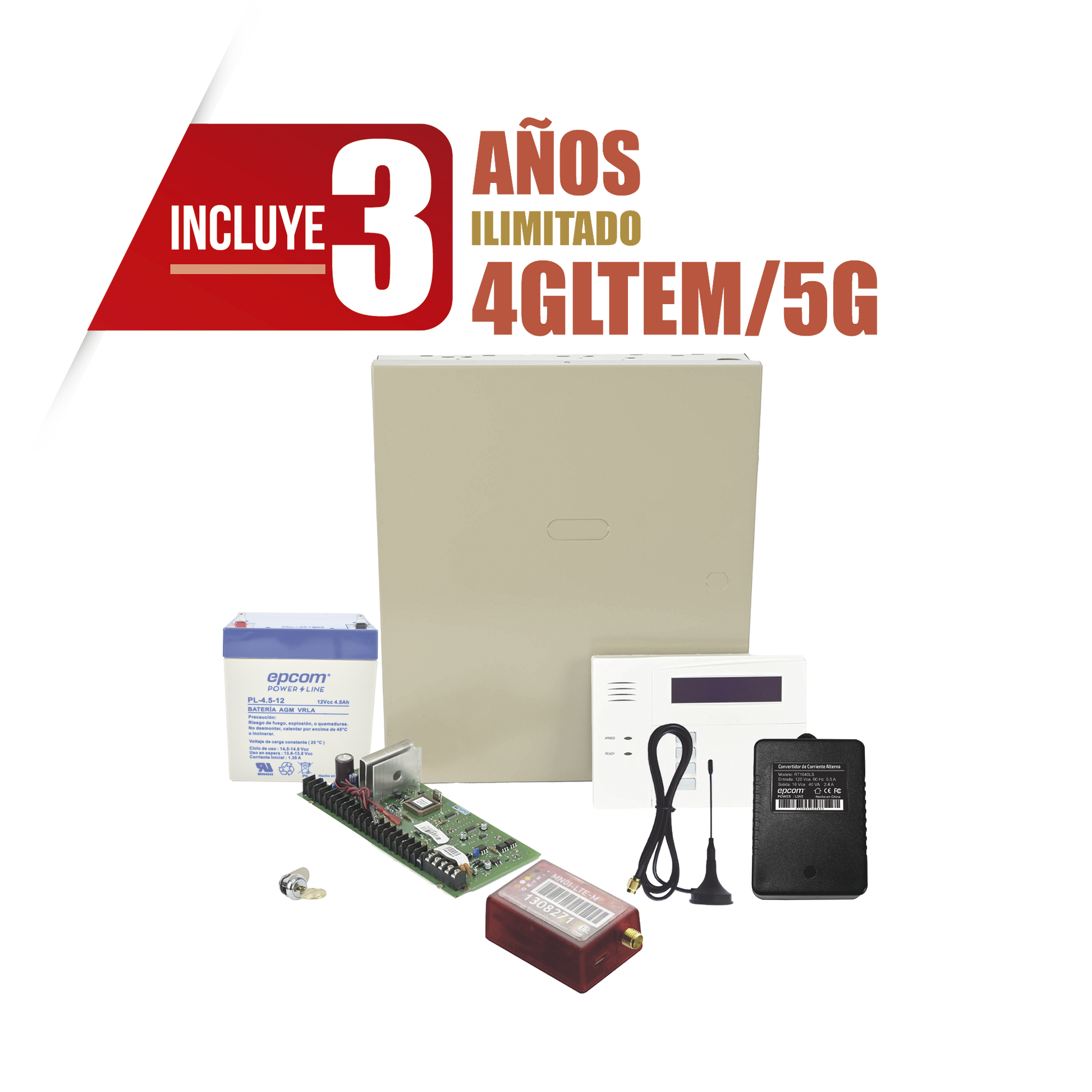 (3 Años 4GLTEM/5G ILIMITADO INCLUIDO) Kit Vista48LA con comunicador 4GLTEM/5G MN01, Teclado, Gabinete, Batería y Transformador