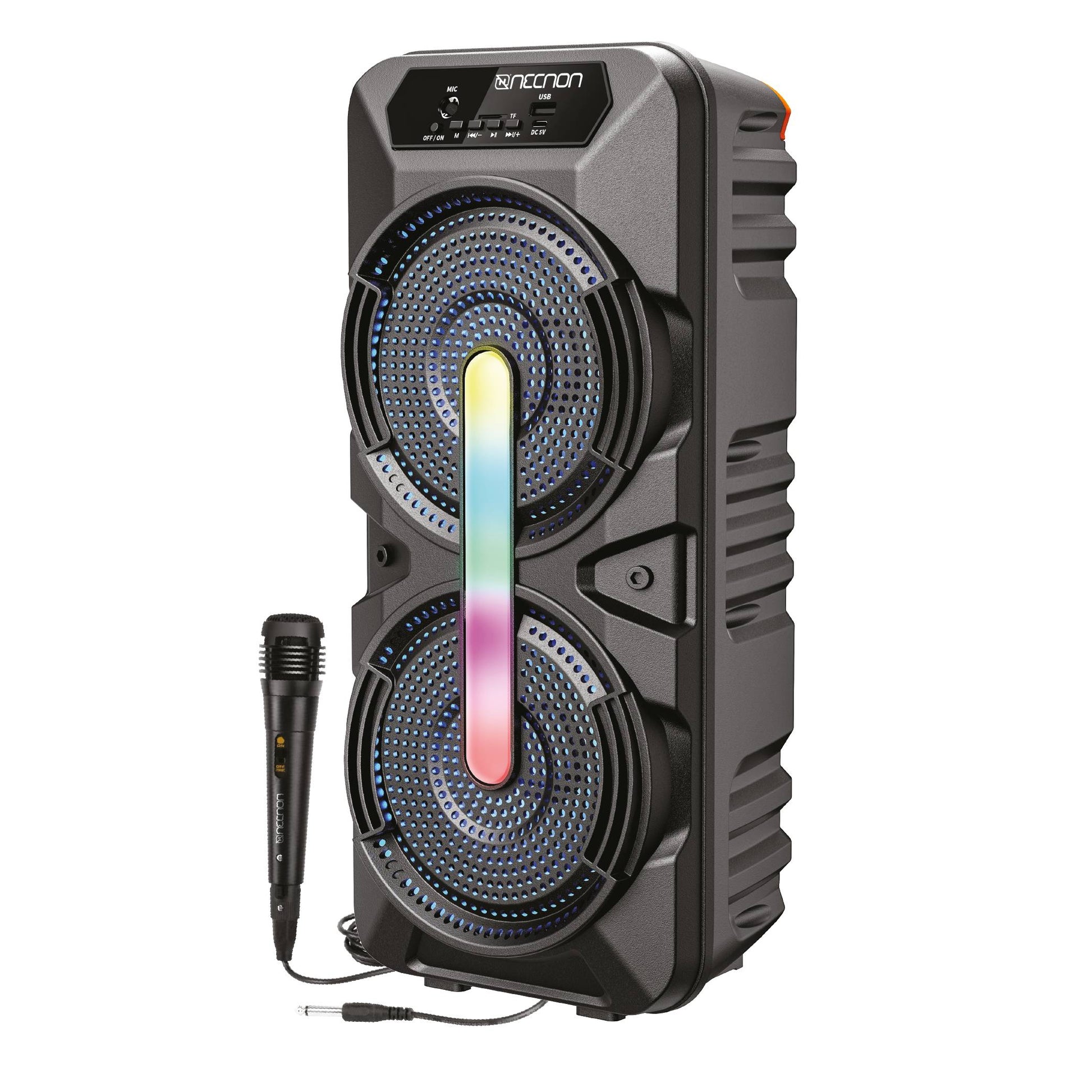 Bafle Karoke NECNON Bluetooth Doble 6.5 pulgadas NB-06B TWS Incluye Microfono Alambrico Radio FM Micro SD USB Barra De Luz LED 6500 Watts NEGRO