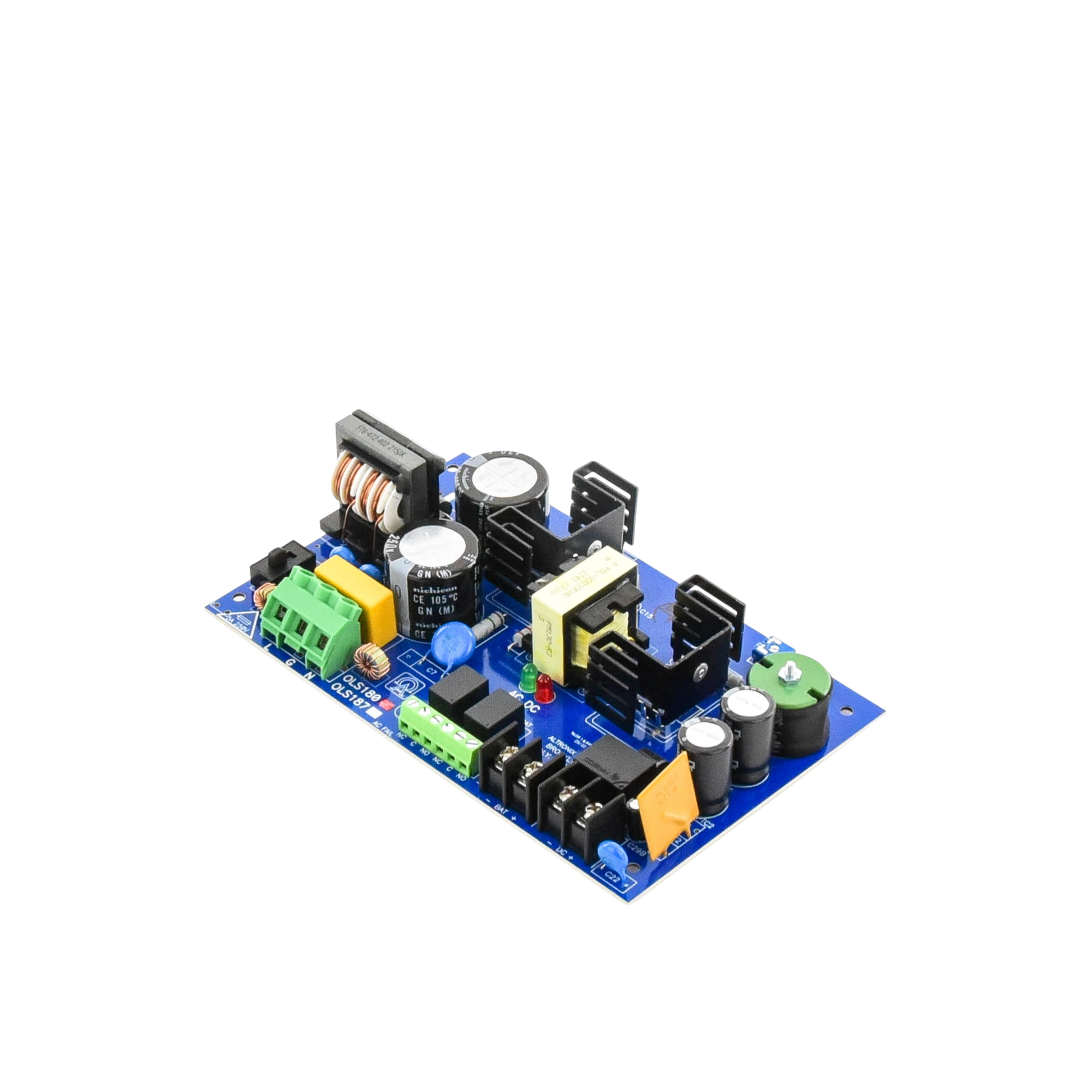 La fuente de alimentación/cargador OLS180 convierte una entrada de 115 V CA, 50/60 Hz en una salida de 12 V CC o 24 V CC a una corriente de suministro continuo de 6 A (consulte las especificaciones). Esta unidad tiene una amplia gama de aplicaciones para control de acceso y accesorios de sistemas de seguridad que requieren energía adicional.